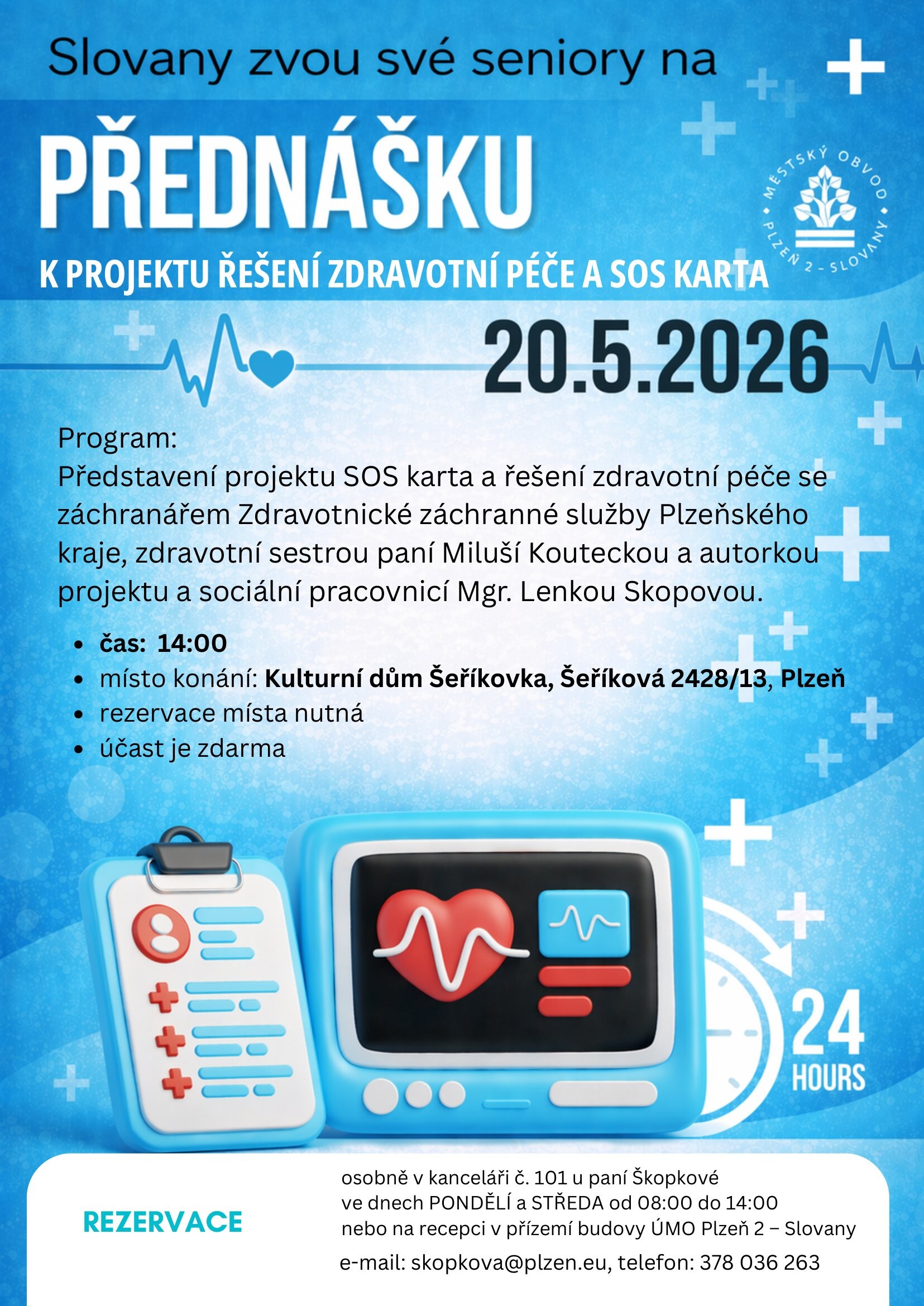 Slovanská radnice zve seniory na jedinečnou přednášku, která představí 20. května v Kulturním domě Šeříkovka od 14 hodin projekt Karta S.O.S. Jeho cílem je jediné – pomoci seniorům být v bezpečí i ve chvílích, kdy nemohou sami komunikovat. Vznikl ve spolupráci sociálního odboru ÚMO Plzeň 8 a Zdravotnické záchranné služby Plzeňského kraje (ZZSPK).