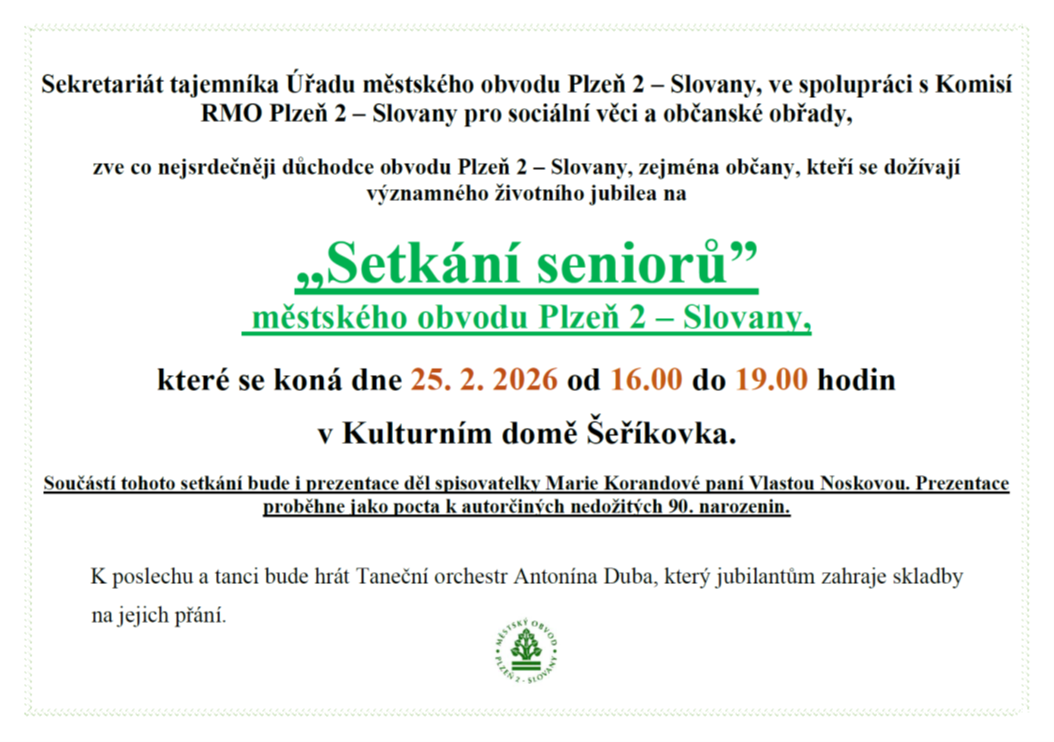 Setkání seniorů MO Plzeň 2 - Slovany dne 25.2.2026 Zpracovala: Jana ŠkopkováÚMO Plzeň 2 - Slovany Poslední aktualizace: 13. 2. 2026, Jan Machačný Sdílet Vytisknout